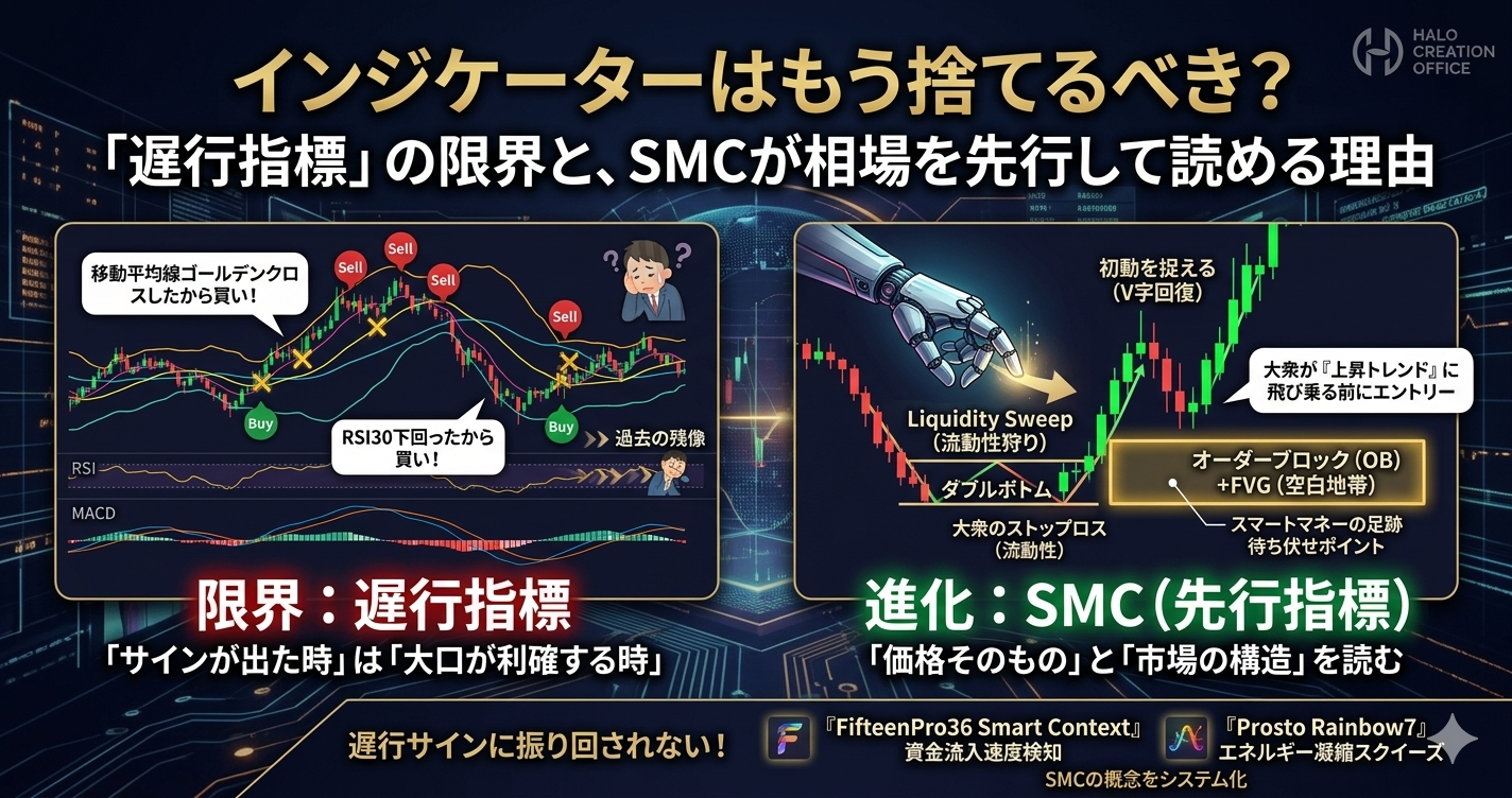 今回は、アルゴリズム開発者である私から、あなたがインジケーターで勝てない「残酷な、しかし極めて論理的な理由」と、今世界中のプロトレーダーが熱狂しているSMC(スマートマネーコンセプト)が、なぜ相場を『先行して』読めるのかについて解説します。