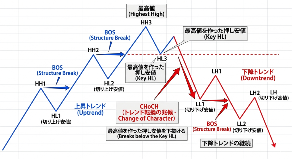 上昇トレンドからのCHoCH: 高値を更新し続けていた相場が、最後に高値を作った起点である「直近の押し目安値」を「下」に抜けた瞬間。