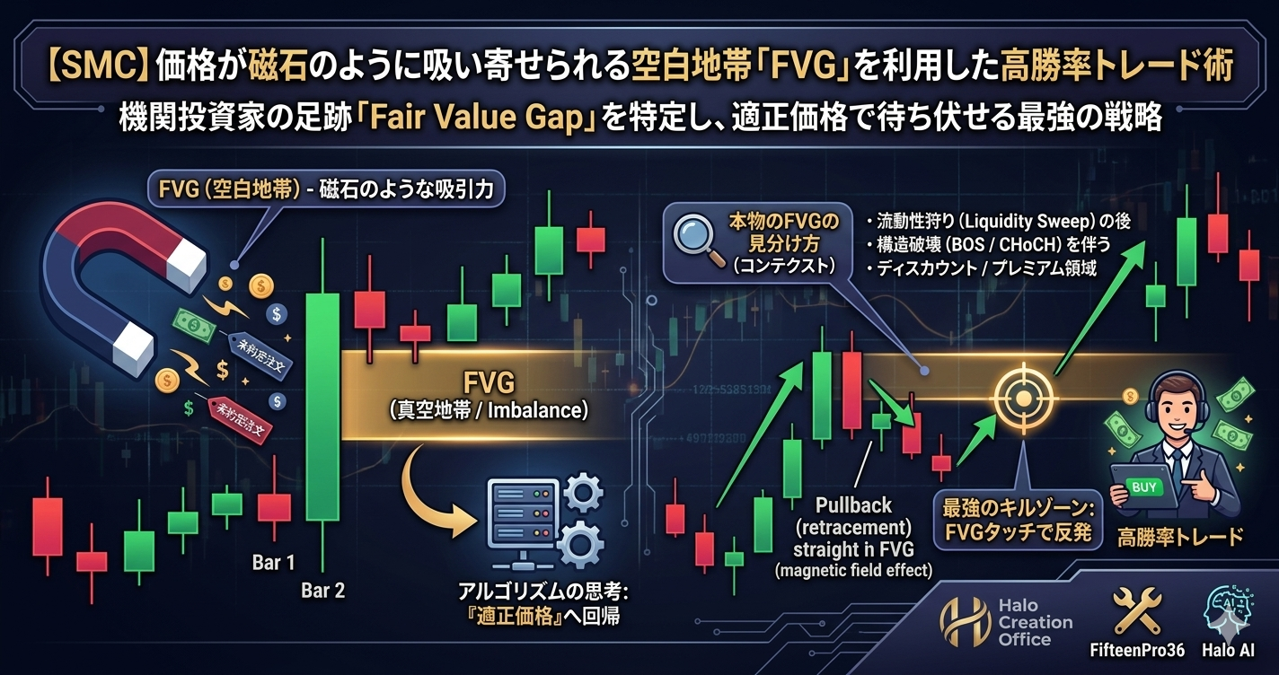 それは、相場の世界を支配する機関投資家(スマートマネー)が残した『FVG(Fair Value Gap = フェアバリューギャップ)』という、価格を吸い寄せる強力な「磁石」がチャート上にぽっかりと口を開けているからです。