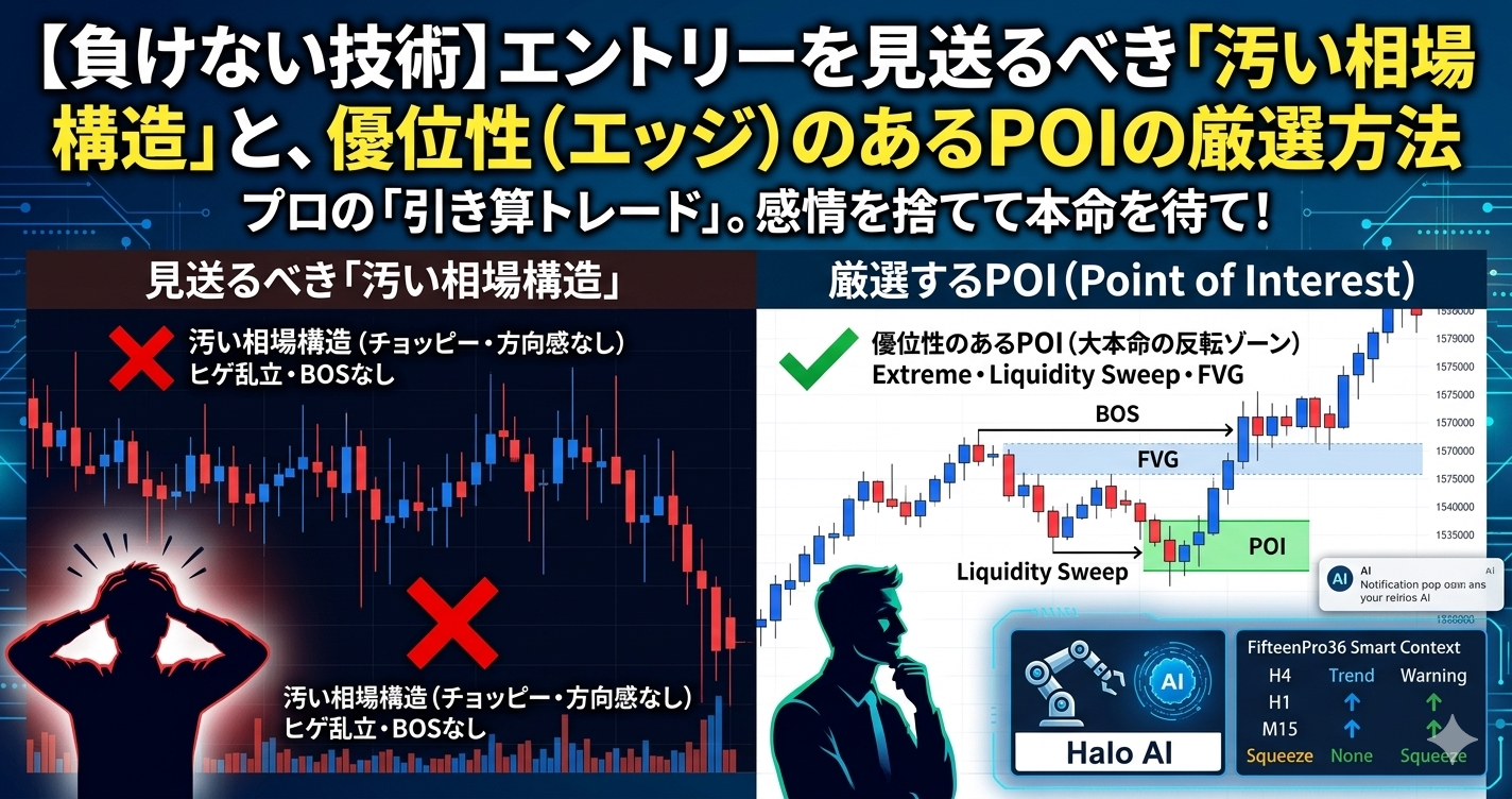 今回は、アルゴリズム開発者である私が、あなたの資金を静かに削り取っていく「汚い相場構造」の特徴と、本当に勝負すべき「優位性(エッジ)のあるPOI(大本命の反転ゾーン)」の厳選方法を徹底解説します。