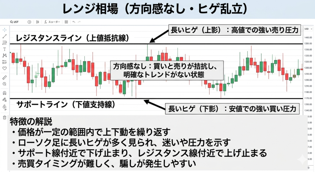 しかし、現実のチャートはそんなに単純ではありません。私たちが絶対に手を出してはいけないのは、レンジの中でも特にタチの悪い「流動性が枯渇した、汚いチョッピー(ギザギザした)相場」です。