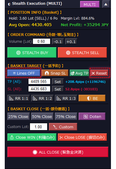 チャートとパネルの完全分離 : パネルを「▲」で最小化しても、チャート上の決済ラインはそのまま残り、背後でEAが正確に監視を続けます。パニック回避「✖ Reset」 : 設定がぐちゃぐちゃになった時、ワンクリックで全てを初期化(白紙)に戻す専用ボタンを右端に配置。DPIスケーリング自動補正(v1.15新搭載): 4KモニターやノートPCでWindowsの拡大設定(125%等)をしていても、パネルのレイアウトが絶対に崩れないプロフェッショナル設計。 トグル式「Lines OFF」 : 一時的にチャートを広く見たい時、設定した価格メモリを保持したままラインを隠せます。もう一度押せば、寸分の狂いもなく元の位置に再表示されます。