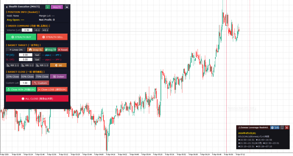 SINGLE Mode(狙撃手) :単一ポジションの精密な分割決済(TP1/TP2)と、建値へのSL移動を自動で行うスナイパーモード。 MULTI Mode(軍隊指揮) :ナンピンやピラミッディング(増し玉)を行った際、自動でパネルが変形。複数ポジションを1つの「バスケット」として統合管理する大将軍モード。